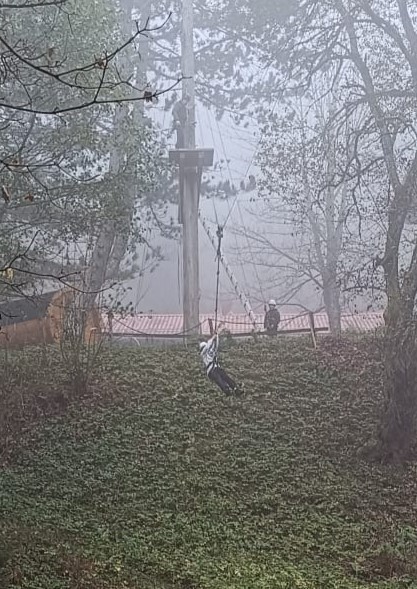 "Der Flying Fox war besonders lustig!" - "Nein, mir ist das Herz dabei fast stehen geblieben!" Die Meinungen zu dem Sprungturm auf der Außenanlage des Outward-Bound-Hauses, von dem aus sich die Schülerinnen und Schüler mit einem Klettergurt und an einem Seil gesichert nach unten fallen gelassen haben, gehen weit auseinander. Denn man brauchte eine große Portion Mut, um in die Tiefe zu springen und 30 Meter bis zum Waldrand in rasendem Tempo durch die Luft zu schwingen.